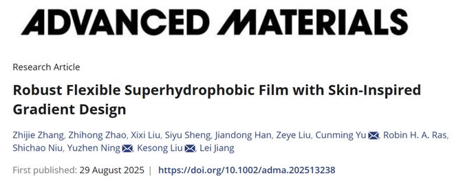近日,北航江雷院士团队刘克松教授、于存明副教授和Ning Yuzheng合作团队,提出了一种受人体皮肤多层次结构启发的梯度设计策略,成功制备出兼具优异柔性与机械鲁棒性的自支撑超疏水薄膜(FSF)。该薄膜通过仿生梯度结构实现了在70%应变、5000次弯曲/拉伸循环、400次Taber磨损、1500小时紫外老化及40天盐雾腐蚀等极端条件下仍保持超疏水性能,同时具备低热导率、优异防冰/除冰性能以及类皮肤透气性与传感功能,为柔性超疏水材料的实际应用提供了新路径。相关论文以“ Robust Flexible Superhydrophobic Film with Skin-Inspired Gradient Design ”为题,发表在Advanced Materials上,论文第一作者为Zhang Zhijie。