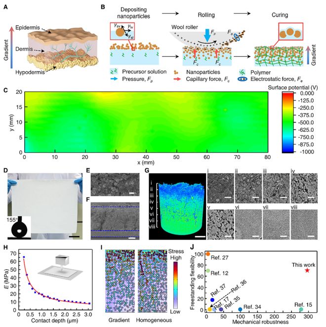 研究团队受人体皮肤表皮、真皮和皮下组织的梯度结构启发,设计了一种由刚性纳米颗粒与柔性聚合物构成的梯度超疏水薄膜。通过羊毛辊压技术,在压力、静电力和毛细作用的协同驱动下,SiO₂纳米颗粒得以有效分散并嵌入PDMS预聚体中,形成由上至下逐渐由硬变软的连续梯度结构(图1A–B)。表面电势分布图证实了静电作用在去除未嵌入纳米颗粒过程中的关键角色(图1C)。所制备的薄膜宽度可达30厘米,具备大规模生产的潜力(图1D)。扫描电镜图像显示其表面具有复杂的微纳粗糙结构(图1E),截面和微CT图像进一步揭示了其明显的梯度层次结构(图1F–G)。纳米压痕实验表明,其杨氏模量从表层的约65.85 MPa逐渐降低至接近纯PDMS的3.14 MPa(图1H),模拟分析也显示梯度结构能有效分散应力,减少损伤(图1I)。与现有超疏水涂层相比,该薄膜在柔性与机械鲁棒性方面表现突出(图1J)。