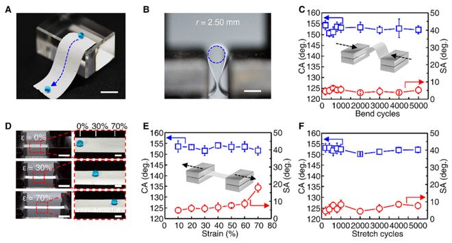 图2. FSF的自支撑柔性 A) 厚度200 μm的FSF上水滴易滚落的照片。比例尺:1厘米。 B) FSF在弯曲测试中展示高柔性,最小弯曲半径r=2.50 mm,弯曲柔性为0.4 mm⁻¹。比例尺:1厘米。 C) 在5000次弯曲循环(从0至0.4 mm⁻¹)中接触角与滑动角的变化。 D) FSF在拉伸测试中展示高柔性与超疏水性。比例尺:2.5厘米(放大图比例尺:5毫米)。 E) 应变从0%至70%拉伸过程中接触角与滑动角的变化。 F) 在5000次0%至30%应变循环中接触角与滑动角的变化。