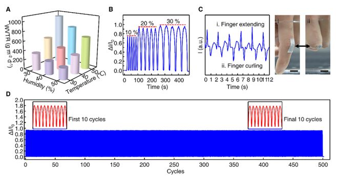 图5. FSF的透气性与传感性能 A) 不同温湿度下FSF的水蒸气透过率(WVTR)。 B) 在0%至10%、20%、30%应变循环中FSF的实时电流变化。 C) 水下附着于人手指的FSF的实时电流变化及对应照片。比例尺:1厘米。 D) 水下500次0%至30%应变循环中传感性能的可靠性测试。