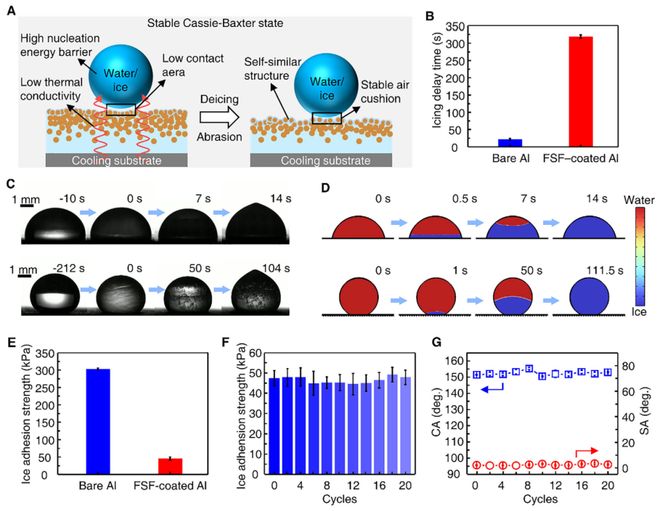 图4. FSF在-20°C、60%RH环境中的防冰与除冰性能 A) FSF的防冰与除冰机制示意图。 B) 裸铝与FSF涂层铝板上20 μL水滴的结冰延迟时间。 C) 裸铝(上)与FSF涂层铝(下)上水滴结冰过程图像,0s为成核起始点。 D) COMSOL模拟水滴从成核到完全相变所需时间。 E) -40°C冻结后冰附着强度对比。 F) 20次冻融循环中冰附着强度的变化。 G) 冻融循环中CA与SA的变化。
