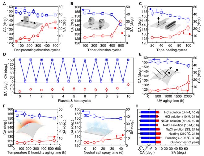 图3. FSF的机械鲁棒性与耐候性 A) 砂纸往复磨损测试中CA与SA的变化。 B) Taber磨损测试中CA与SA的变化。 C) 胶带剥离测试中CA与SA的变化。 D) 等离子体与加热循环中CA与SA的变化。 E) 紫外老化测试中CA与SA的变化。 F) 高温高湿老化测试中CA与SA的变化。 G) 中性盐雾测试中CA与SA的变化。 H) 多种标准耐久性测试后的CA与SA总结。