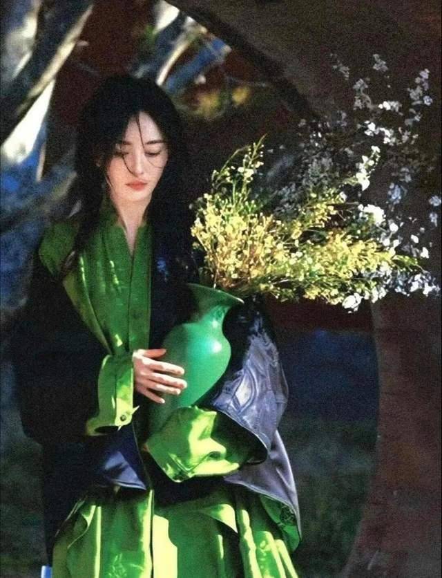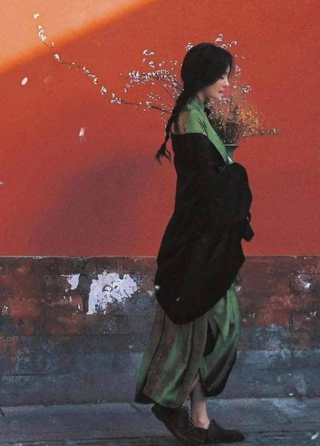 一袭绿色的新中式长袍,外面叠穿黑色外套,站在红墙前面显得文艺范十足,不得不说,杨幂现在体态真是越来越好了,肩背挺拔舒展、抬头挺胸,背部薄的跟张纸一样,真是连少女都羡慕的身材。